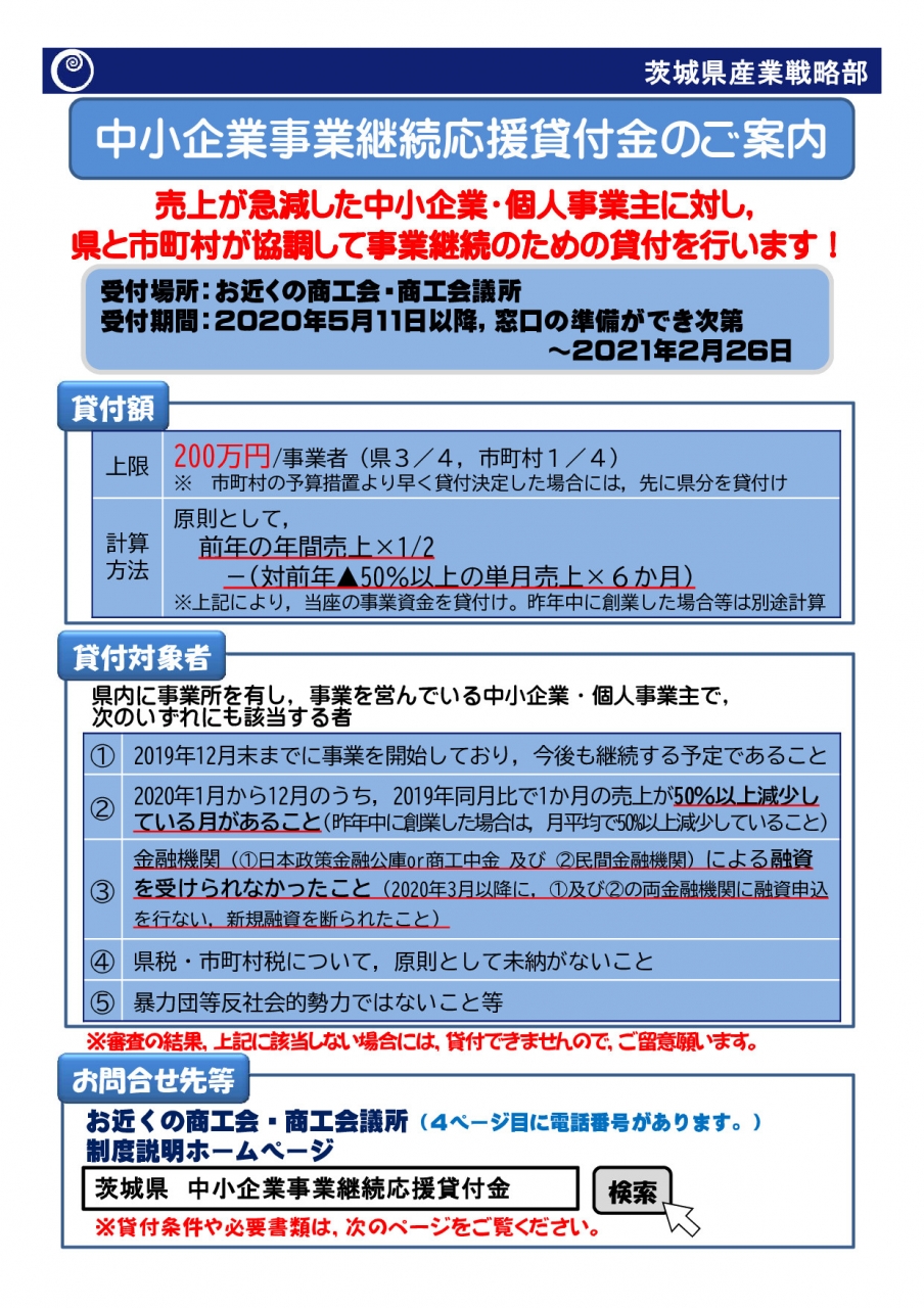【茨城県コロナ:中小企業事業継続応援貸付金のご案内】