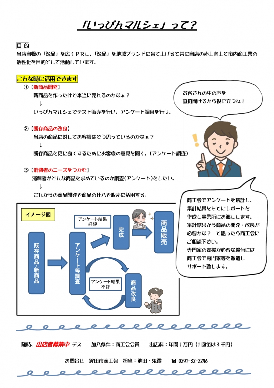 いっぴんマルシェ 出店者募集について 2019 1/22 お知らせ 2019年1月22日2026年1月26日 いっぴんマルシェでは、出店者の募集を行っております。 hspace=”0″ /> いっぴんマルシェを活用して売り上げを伸ばそう! hspace=”0″ /> お知らせ よかったらシェアしてね! URLをコピーしました! キャッシュレス決済セミナーを開催します! カラオケ大会 出場者募集について
