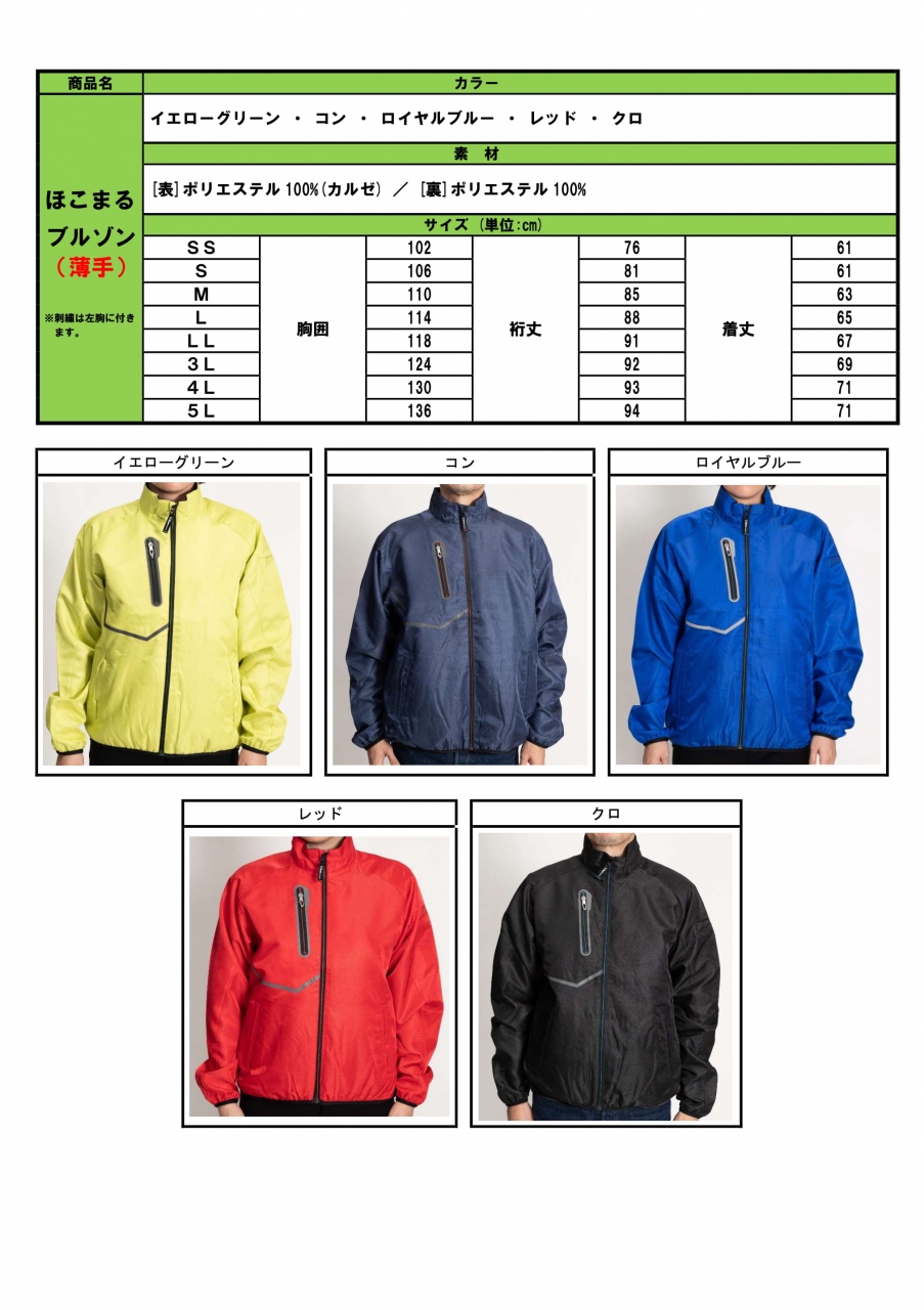ブルゾン(薄手)カラー5色 サイズSSから5Lまで @4,000円(税込)