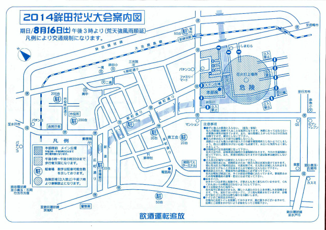 花火大会交通規制案内図について 2014 8/08 お知らせ 2014年8月8日2026年1月26日 花火大会交通規制について 花火大会開催日平成26年8月16日(土)は 午後3時より凡例により交通規制となりますので、ご注意下さい。 ※荒天強風雨順延 2014花火大会案内図.jpg お知らせ よかったらシェアしてね! URLをコピーしました! 鉾田花火大会模擬店広場のお知らせ 鉾田花火大会のお知らせ【現在検討中】
