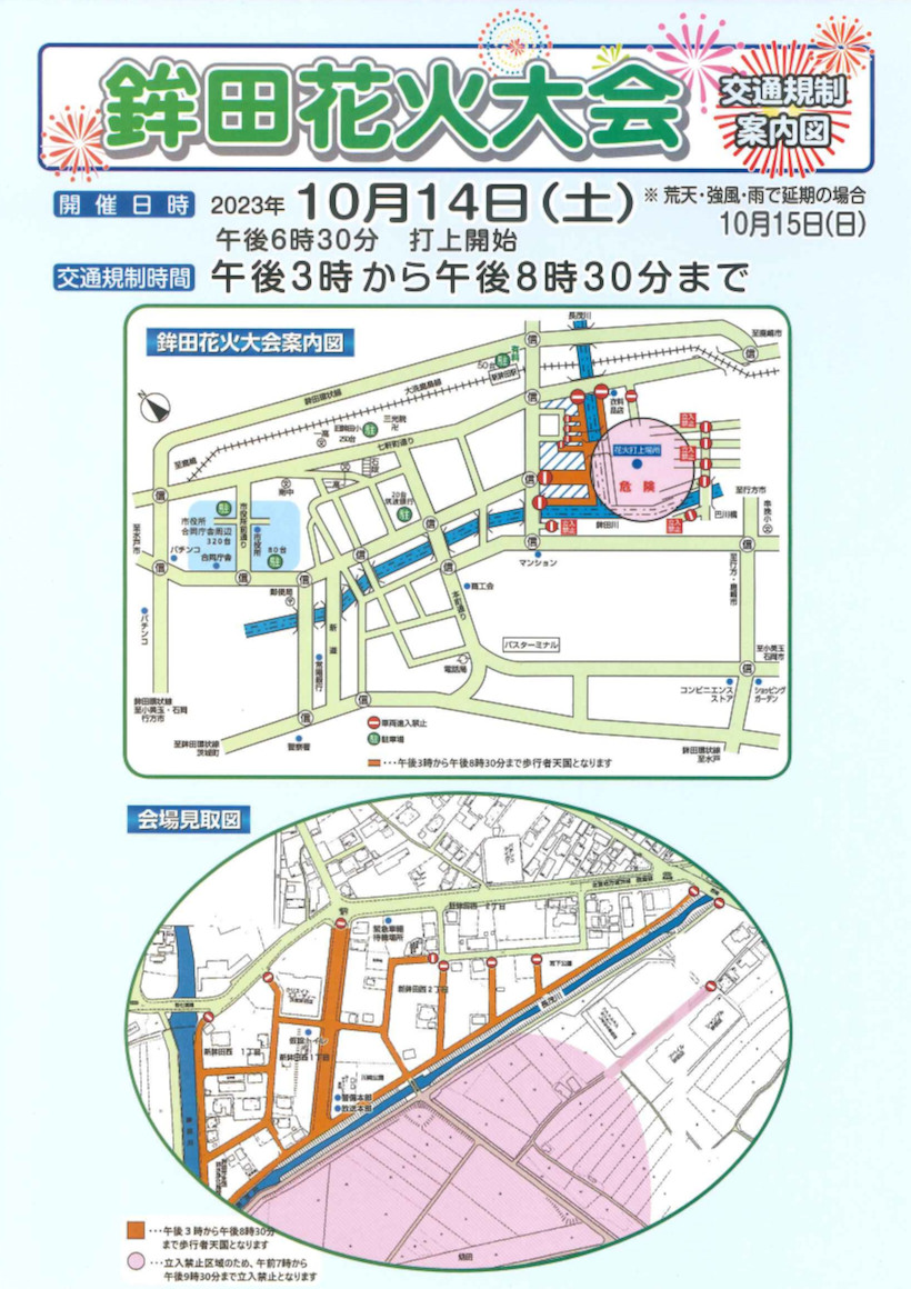 鉾田花火大会会場案内図および交通規制のご案内 2023 10/12 イベント情報 お知らせ 2023年10月12日2026年1月26日 鉾田花火大会会場案内図および交通規制のご案内 10月14日の鉾田花火大会当日は、会場周辺では大変な混雑が予想されます。 臨時駐車場が極めて少ないので、花火観覧に際しては電車などの公共交通機関のご利用を お願いいたします。>花火大会交通規制(PDF).pdf イベント情報 お知らせ よかったらシェアしてね! URLをコピーしました! 令和5年度鉾田花火大会開催のお知らせ 鉾田花火大会プログラムの 掲載について